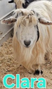 Hi! My name is Clara. I am a doe. I am a mini silky fainter. I am mostly white with very little black spots with really long hair and a fun top knot.