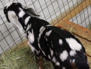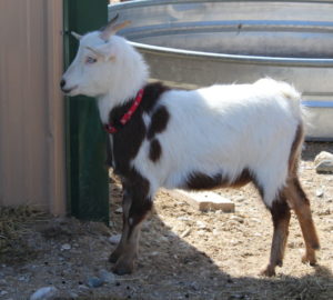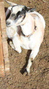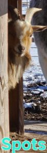 Hi! My name is Cassandra. My barn name is Cassy. I am a Doe. I am a Nigerian Dwarf cross. I am white with lots of spots.