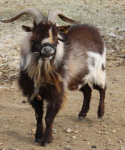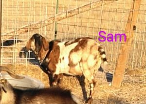 Hi! My name is Sam (I have a really long registered name.) I am a buck. I am often very smelly! I am brown and white with black, white and brown spots. I also have a dun stripe.