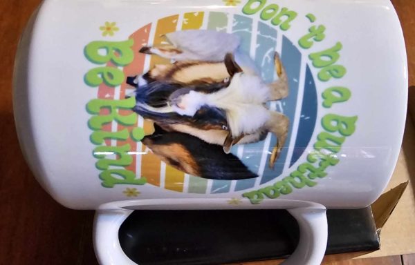 This 15oz ceramic mug is perfect for animal lovers and yoga enthusiasts alike. It features a fun slogan “Don’t be a Butthead, Be Kind!” that will bring a smile to your face every time you use it. The slogan is on both sides of mug.