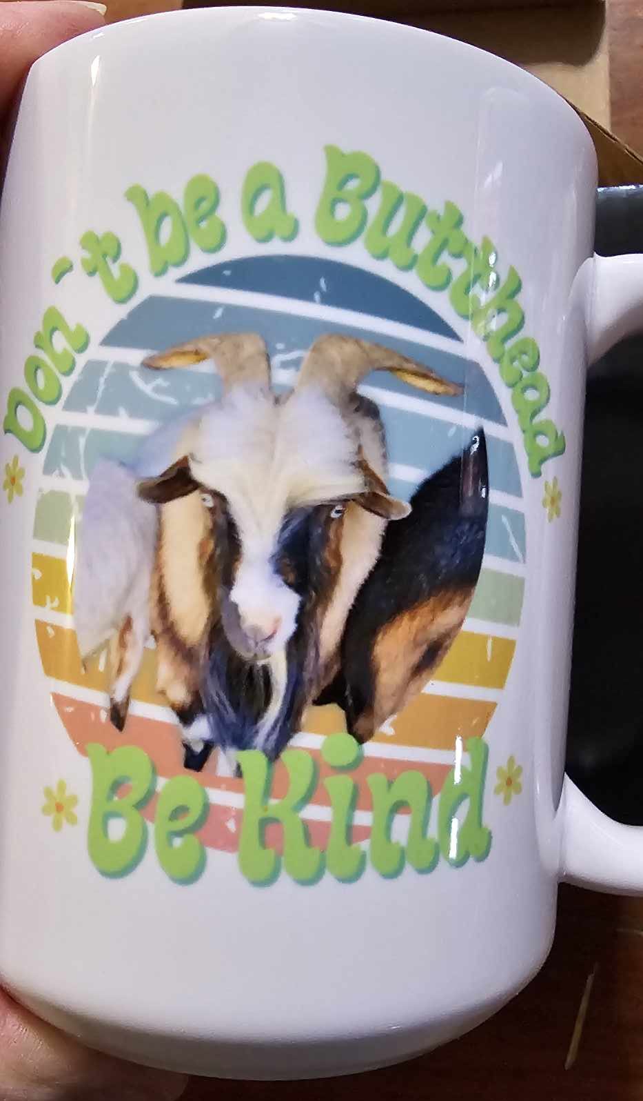 - Slogan & Animals design (Pattern):The Animal design (Pattern) along with the Slogan “Don’t be a Butthead, Be Kind!” on this Mug makes it stand out among other mugs. The Goat on this mug is MJ he is a buck that lives at the rescue.