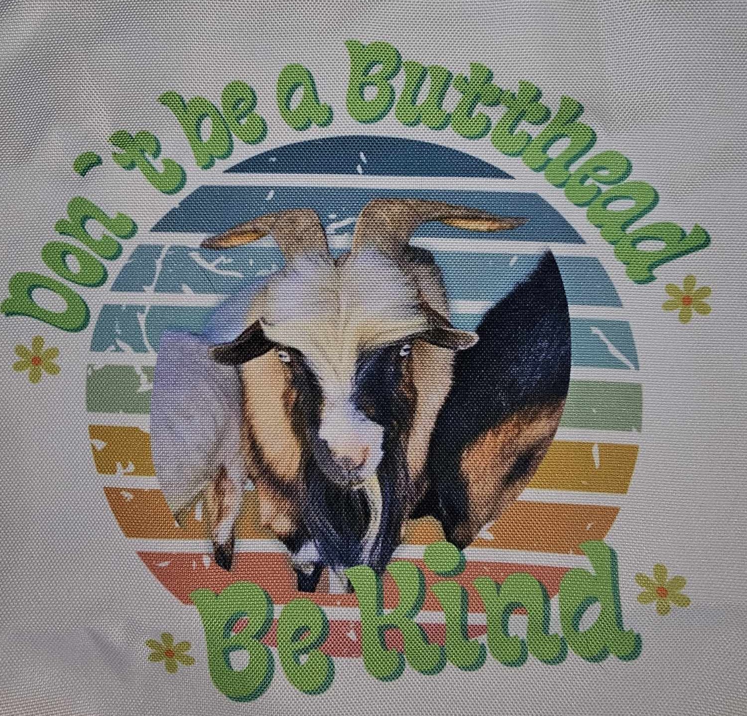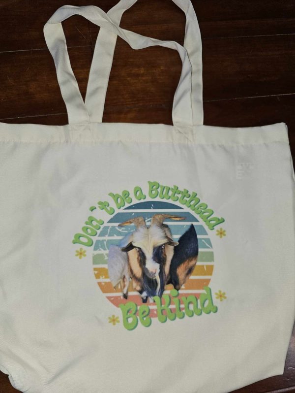 The Bag on the front says Don’t be a Butthead Be Kind. On the back is the Rescues Logo.
