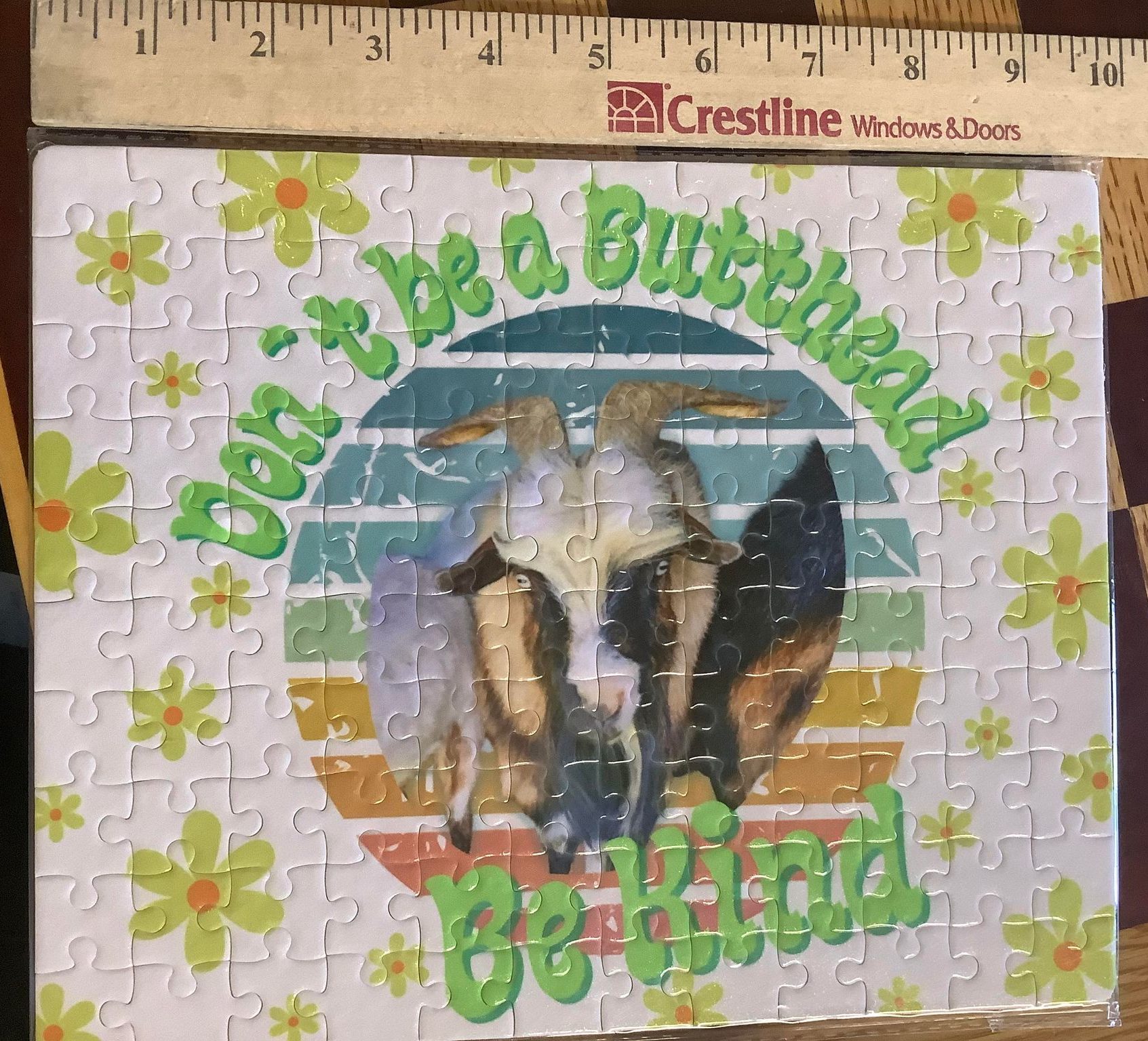 This 120-piece Butthead puzzle stars a cute goat with a big personality—and an even bigger message: “Don’t be a Butthead, Be Kind!”