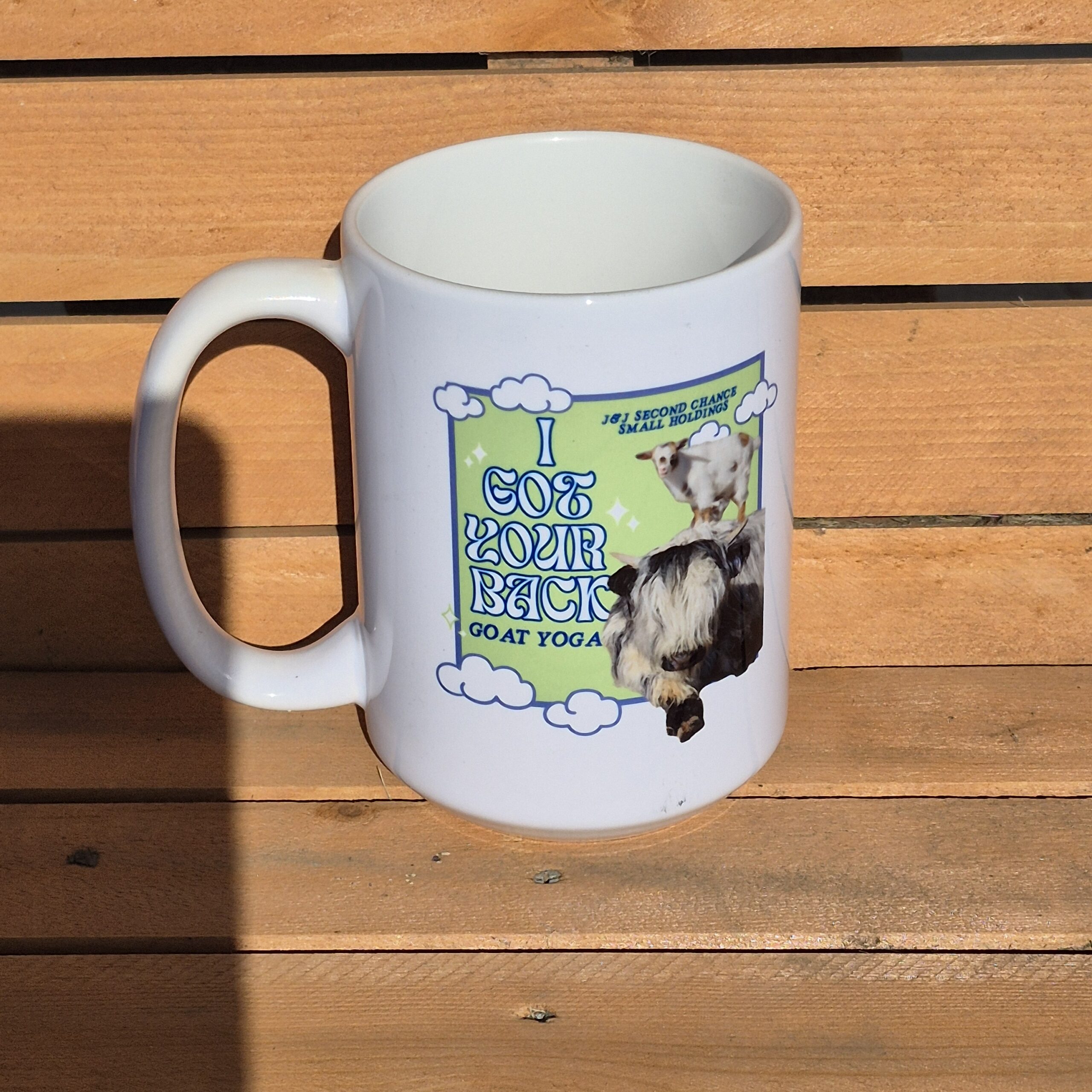 This is a screen-printed dishwasher-safe mug. Featuring our own animals.