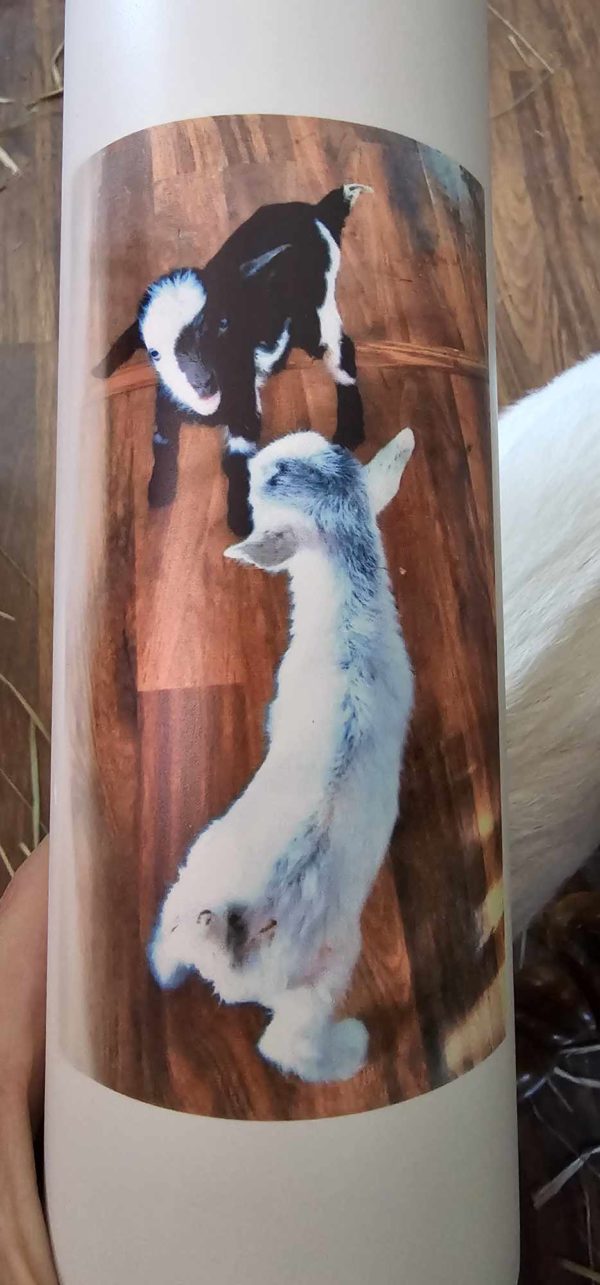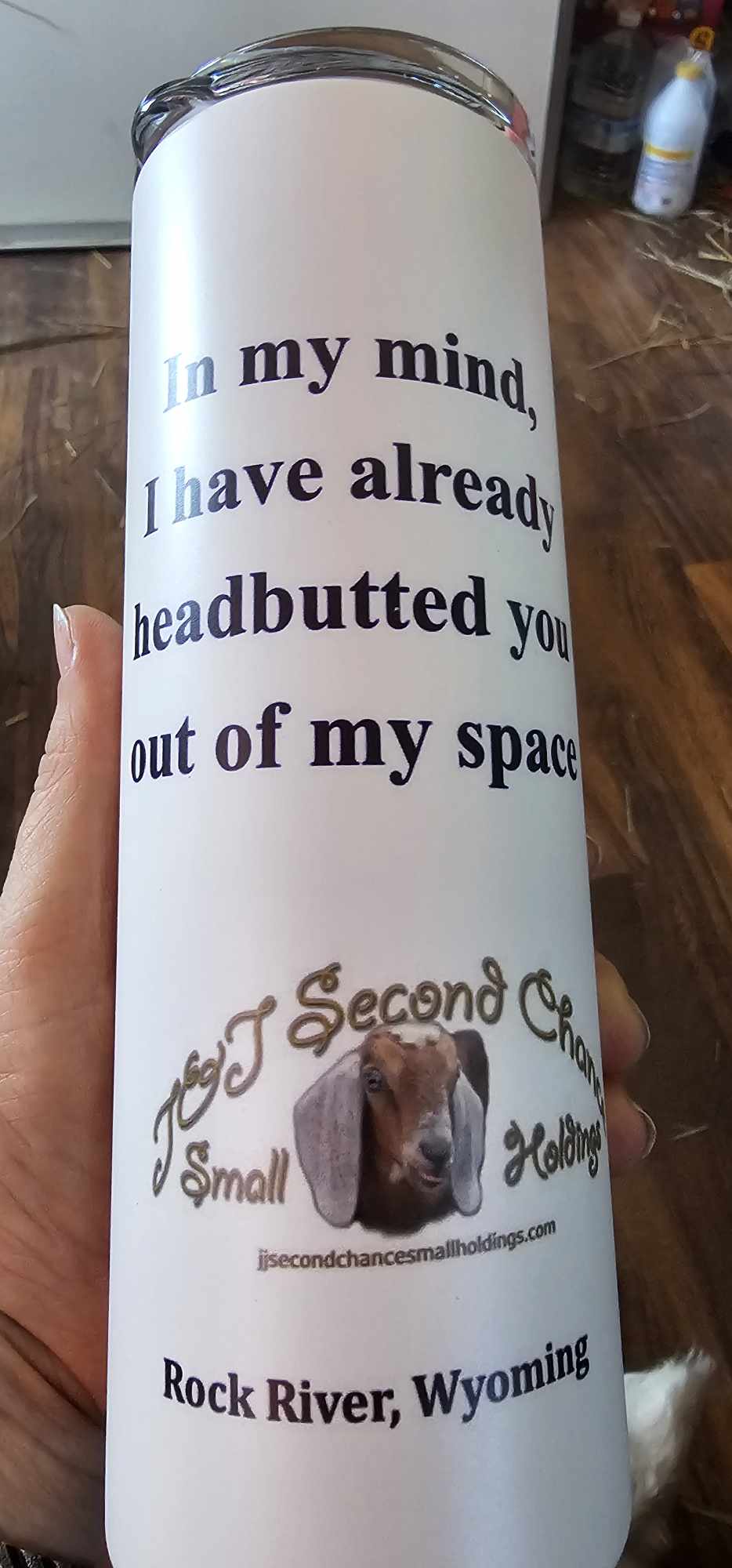 Adding a playful touch, our tumbler features a set of twin fainting goats, named Yin and Yang, facing off in a whimsical showdown. This delightful design not only adds character but also supports Animal Rescue through J & J Second Chance Small Holdings in Rock River, Wyoming. The rescue’s logo proudly adorns each tumbler.