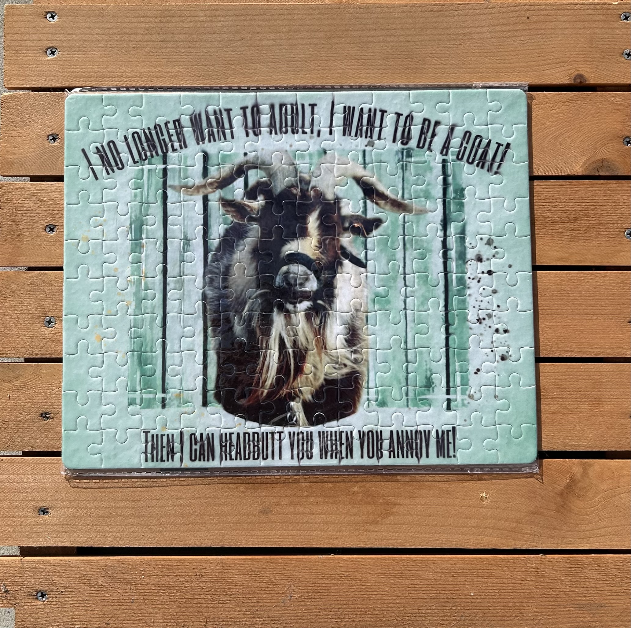 This is a screen-printed 120-piece puzzle. Showcasing our very own goat.
